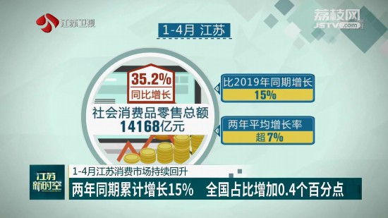 據(jù)相關統(tǒng)計數(shù)據(jù)顯示,今年1-4月,江蘇實現(xiàn)社會消費品零售總額14168億元,同比增長35.2%,比2019年同期增長15%,兩年平均增長率超7%,已達到往年正常的增長水平。從全國層面來看,1-4月江蘇社會消費品零售總額占全國的10.2%,較上年提高0.4個百分點,繼續(xù)穩(wěn)居全國第二。江蘇消費市場增幅好于全國、好于周邊。