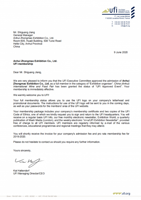 2020年6月9日,UFI(全球展覽業(yè)協(xié)會)巴黎總部傳來喜訊:中法合資高博中貿(mào)會展在山東、江蘇、安徽主辦的CNFE全國食品博覽會(濟南)、CNWFF中國(南京)···